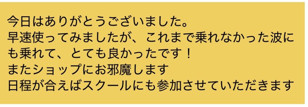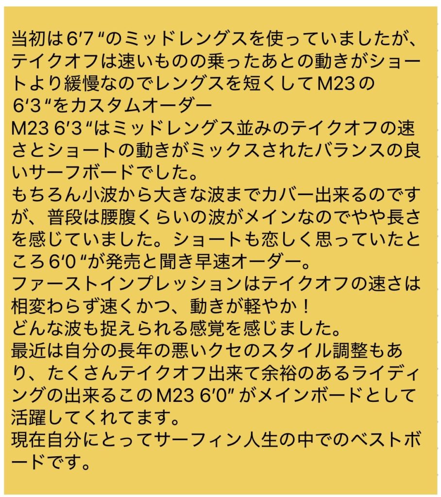 こちらは北九州からご注文いただいたM23の6’4″が届いた方のレビュー。