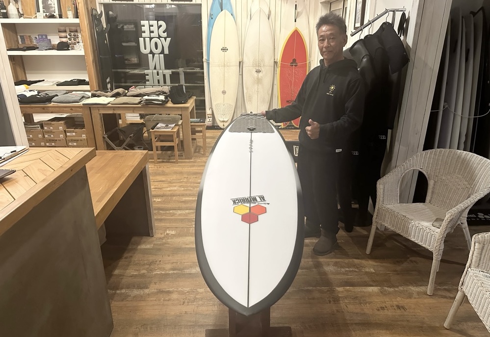 多くの波に乗れるミッドレングスで変化できたのをご自身も実感していて、普段使うショートボードとの中間サイズで選ばれたM23は6’2″。