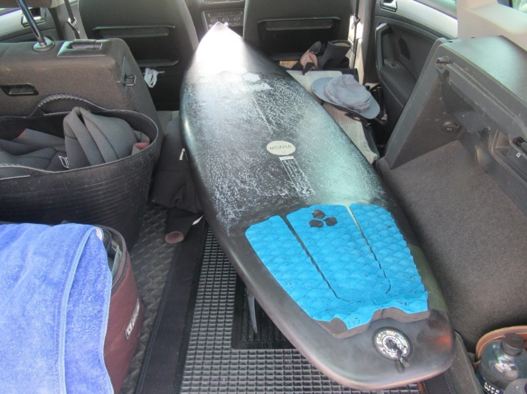 今朝も駐車場で着替えてビーチまで数分歩いた後、浜に置いて軽い運動をしてからボードのデッキ面を見てもワックスは溶けてしまっていたり熱くて持てなくなる事もなく、通常の白いPUボードと同じ扱いで大丈夫でした。