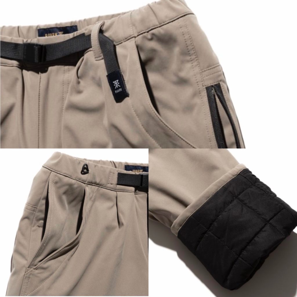環境負荷の低い原料を使用し、ドライな質感で透湿・速乾・耐摩耗・ストレッチ・撥水・耐久性の機能を併せ持つ ROARK独自開発ファブリック”ROAMFREE FLEX”を使用し、裏地にキルティングを施し中綿にはデュポン社製の 植物由来でつくられた高性能中綿SORONA®ファイバーが採用され、軽量かつ高い防寒性を併せ持ちます。 磁石で開閉が容易になったスマートフォン用サイドポケットや、ポケット内部にコインポケットを追加した、TRAVEL PANTS。 180度自然な開脚が可能なガゼットクロッチ、象徴的なバーティカルジップポケット、 片手でも調整可能なベルトの仕様と高い機能性も併せ持つ。ウェービングベルトにはROARKのブランドアイコン、 バックポケットにはブランドロゴがあしらわれています。 STANDARD FITは、適度なワタリと裾にかけて自然に細くなるロアーク標準のテーパードシルエットとなるフィッティングラインです。